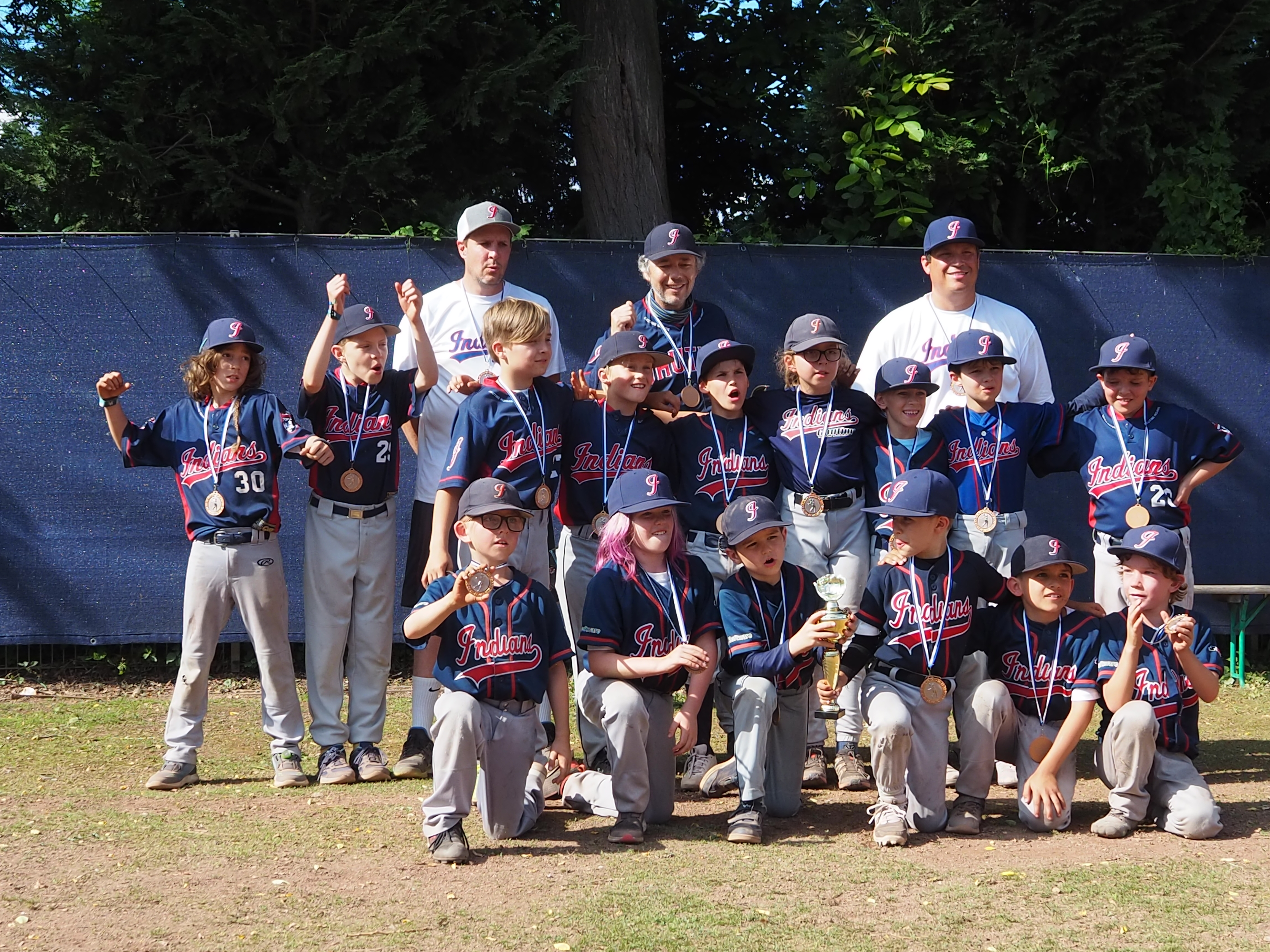 Die Nachwuchs-Baseballer der Gauting Indians belegten sensationell Platz 3 bei der Deutschen U10 Meisterschaft 2024 in Köln (22./23.06.2024). Trotz der langen Anfahrt am Freitag Abend und in der Folge wenig Schlaf absolvierten die als reine Vereinsmannschaft angetretenen Gautinger einen perfekten ersten Tag mit 5 Siegen in 5 Spielen. Sie setzten sich gegen starke Gegner durch, die zum Teil aus Auswahl-Teams und Spielgemeinschaften bestanden. Zum Turnierstart um 9:00 Uhr gelang mit 8:4 gegen Nord Baden der erste Sieg. Anschließend folgten ein 14:6 gegen Solingen/Ratingen und ein 5:2 gegen Wuppertal. Richtig spannend wurde es, als die Indians gegen Westphalen das Spiel im letzten Inning drehten und mit 9:8 für sich entschieden. Im letzten Spiel des Tages bezwang Gauting das Team aus Main Taunus mit 6:2. Damit führten sie die Tabelle mit 5:0 als einzig ungeschlagenes Team nach Tag 1 an.